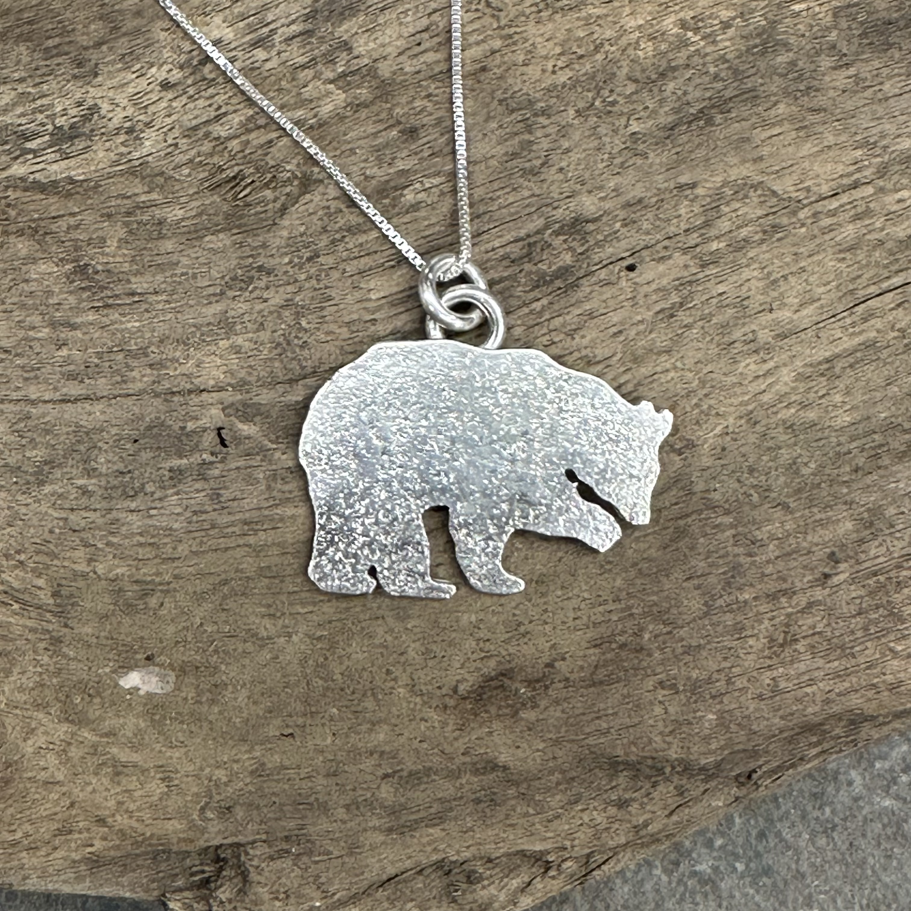 Bear silhouette pendant; I hand saw / cut the bear shape from sterling silver sheet, and then give it texture for a “fur-like appearance.