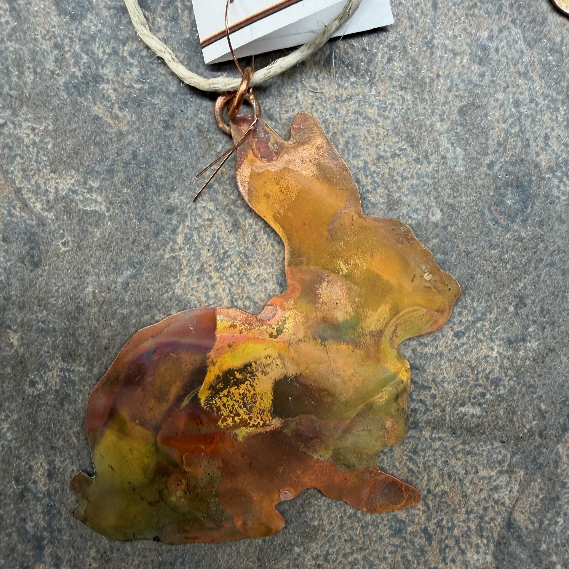 Copper bunny / rabbit silhouette is hand cut from copper sheet metal, slightly hammered to give it a domed dimension...it's not perfectly flat, and patinaed.