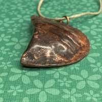 Pierogi ornament, done in flame-patinaed copper, measures approx. 2 1/2 inches tall x 1 1/2 inches wide, give or take a bit. Depth/thickness at widest point will vary, approx. 1/4" to 3/8", give or take a bit. This is definitely a 3-D form rather than flat. Hollow in the middle.