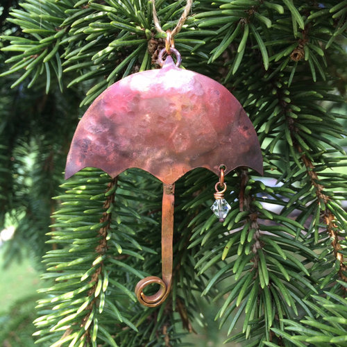 In commemoration of rainy days....here's my beautifully simple umbrellla ornament. Hand cut from copper, flame patinaed....then accented with a 6mm Swarovski Crystal "raindrop".