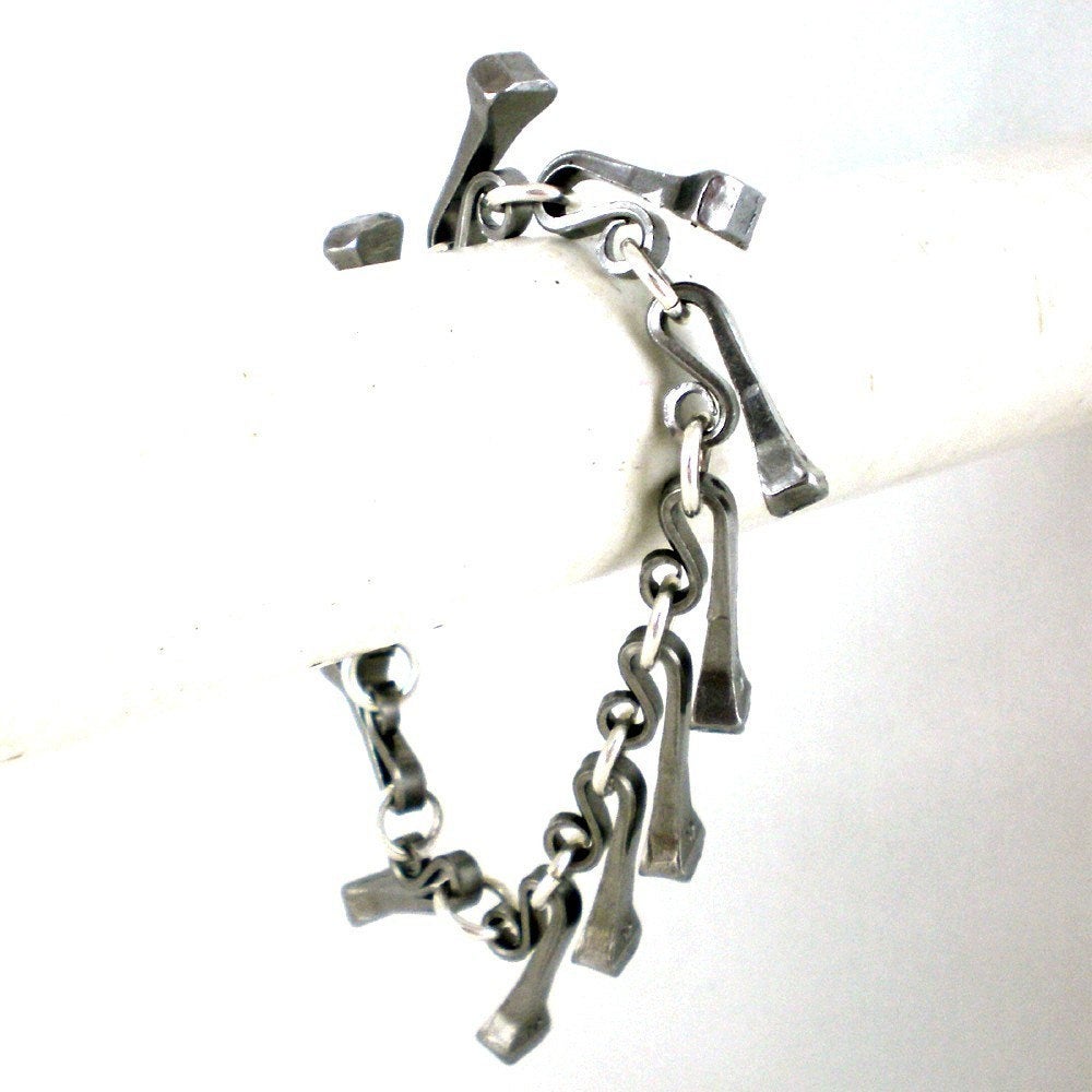Bracelet is made using bent, curved horseshoe nails, linked together with heavier gauge sterling silver links. Stainless steel lobster clasp.