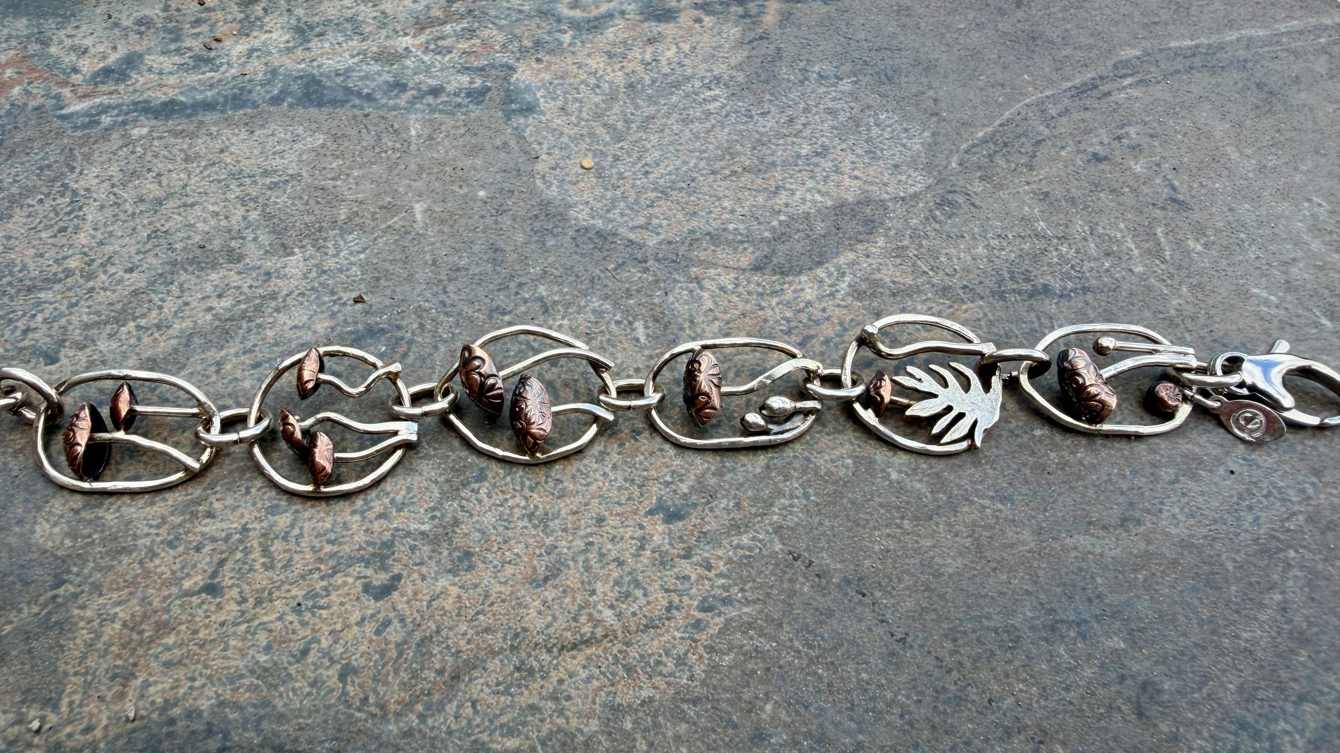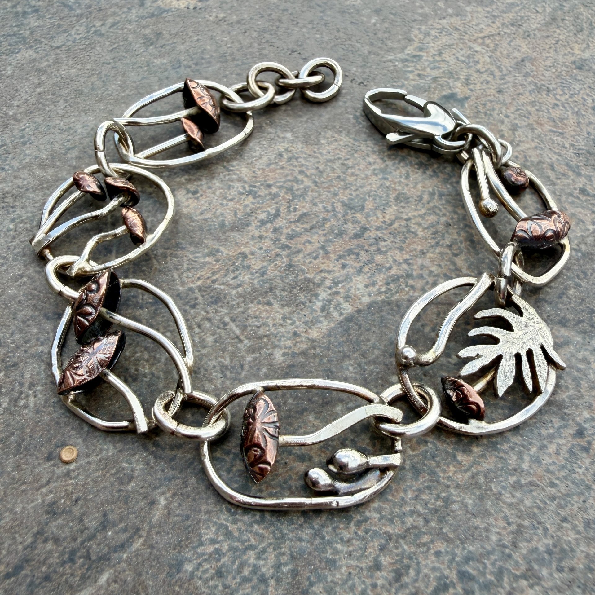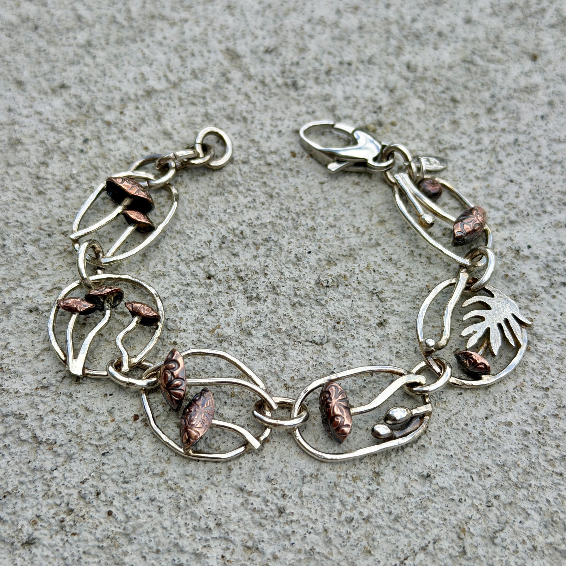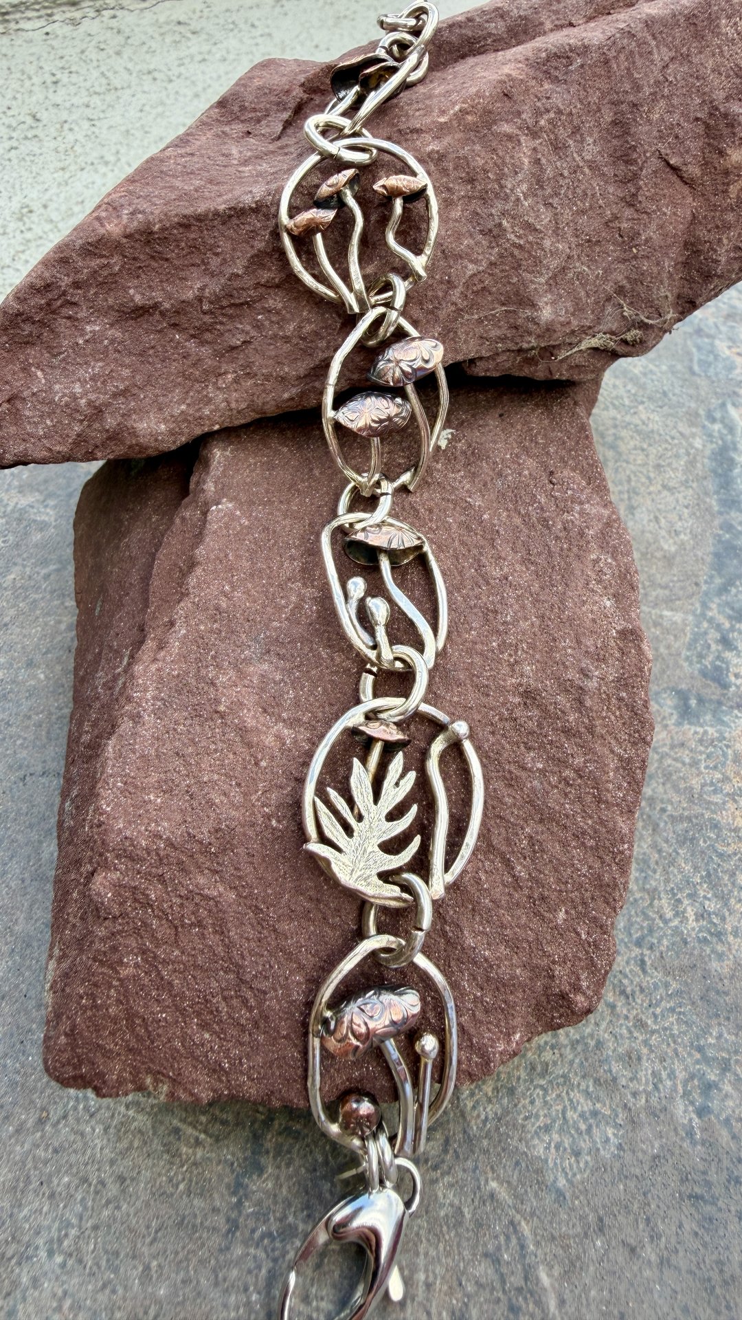 This one-of-a-kind bracelet features six “mushroom scene” links, each individually and entirely hand fabricated, using sterling silver and copper. Organic silver shapes create a natural forest floor landscape, while warm copper mushroom tops add contrast, texture, and depth, giving this bracelet an earthy, woodland feel. Subtle variations from link to link highlight the handmade process, making each section unique while still part of my cohesive design.
