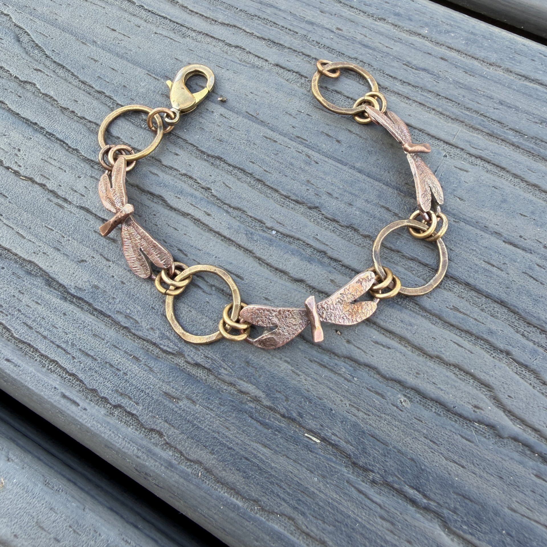 Three copper dragonflies, separated by bronze circle links will surround your wrist. Each dragonfly has a slightly different pattern.