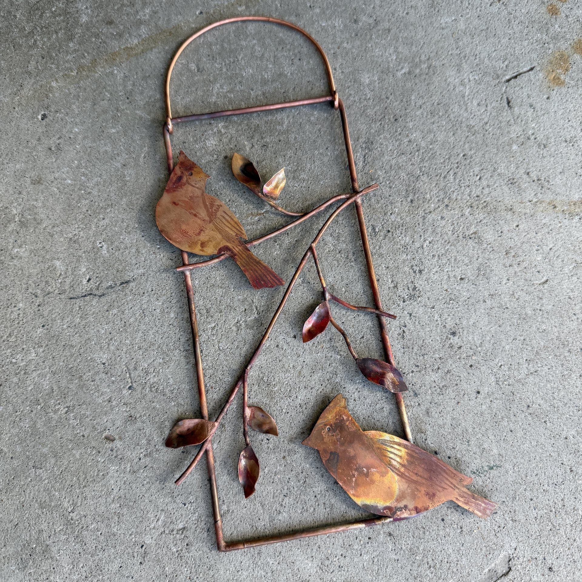 Miniature art picture done in copper, featuring two cardinals and a leafy branch, inside a rectangular shape.